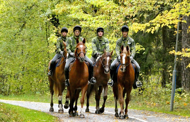 Då fredligare med fyra militärhästar vid möte i Lill-Jansskogen.